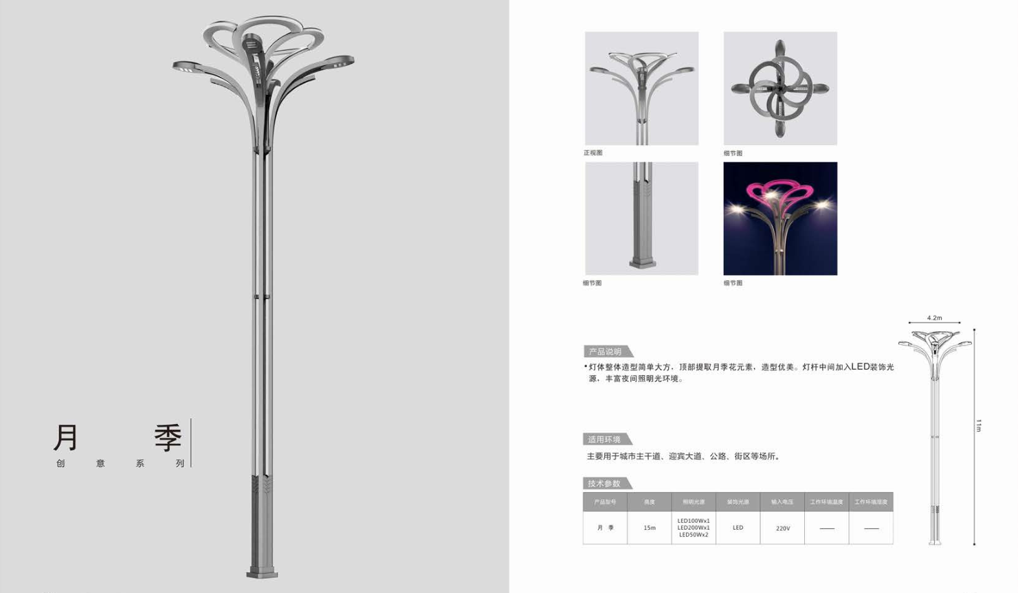 1、高度為6-16米; 2、光源為4組LED光源,色溫2500-6500K,每個光源功率為60-300W,頂部為四處七彩光環構成; 3、LED驅動電源壽命可達五年; 4、整體熱鍍鋅噴塑,保證燈桿15年不生銹; 5、可以根據使用地區的地域文化、產業特點等進行文化定制;